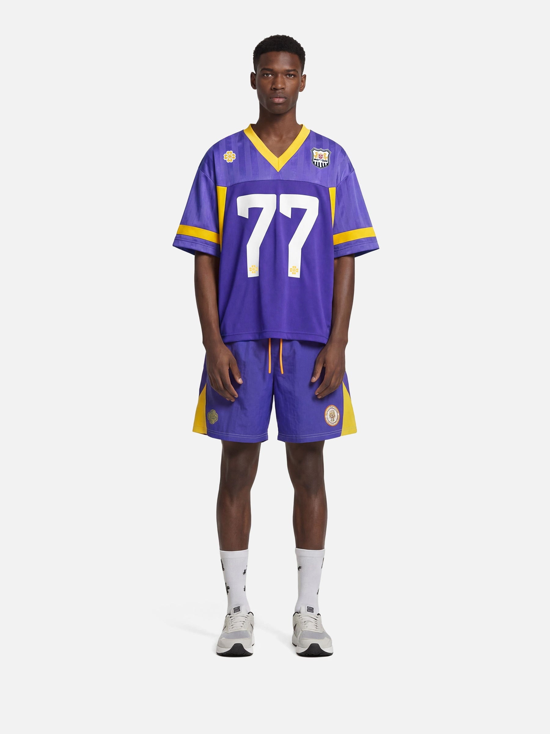 Inspired by classic sports jerseys, this V-neck jersey features a bold “77” graphic and sharp contrast trims that bring instant athletic energy. The lightweight, breathable fabric keeps the feel easy and wearable, while the cropped proportions add a modern streetwear attitude. Finished with Aelfric Eden signature patches, it’s designed to stand out whether worn on its own or layered into everyday looks.