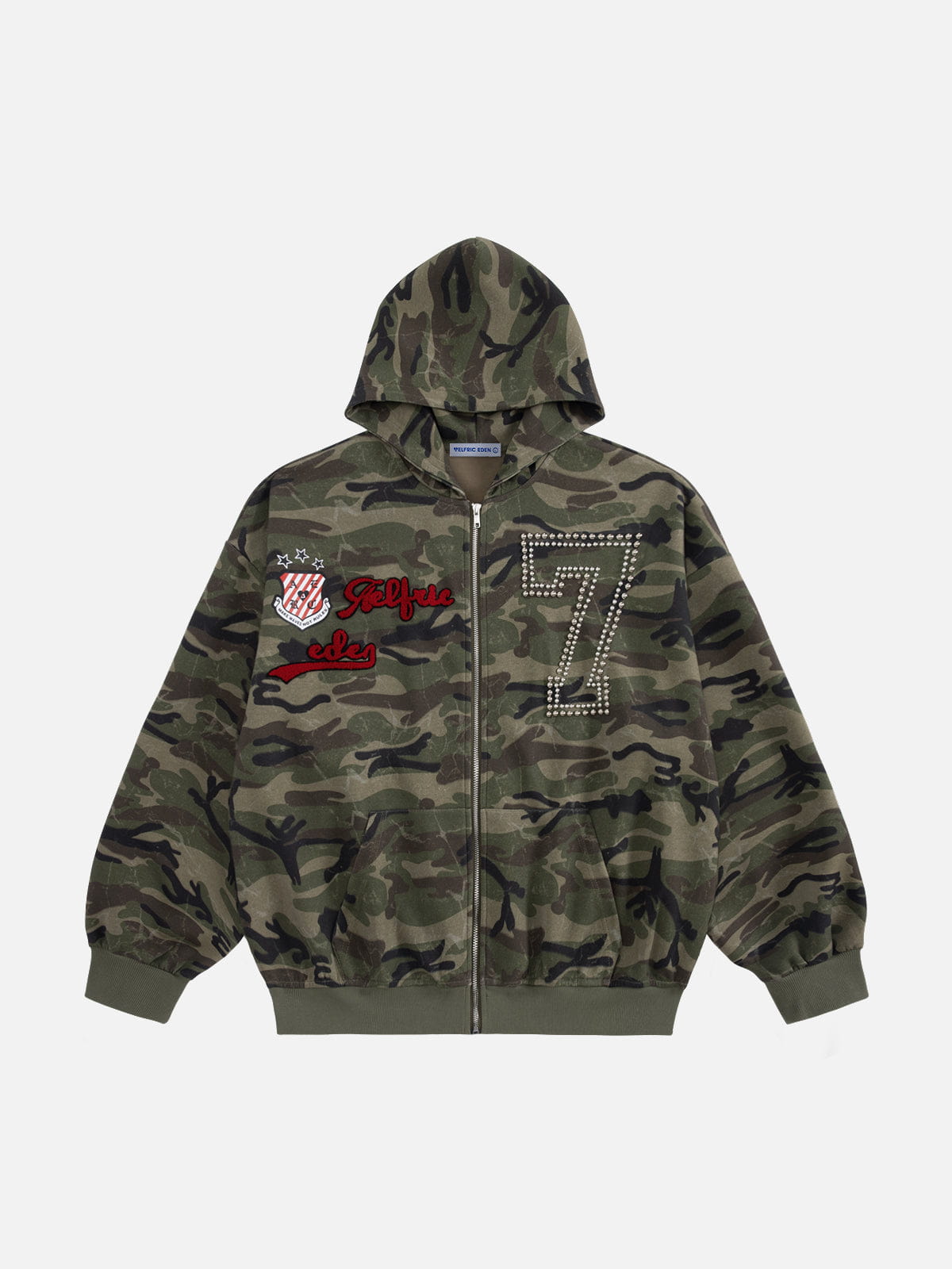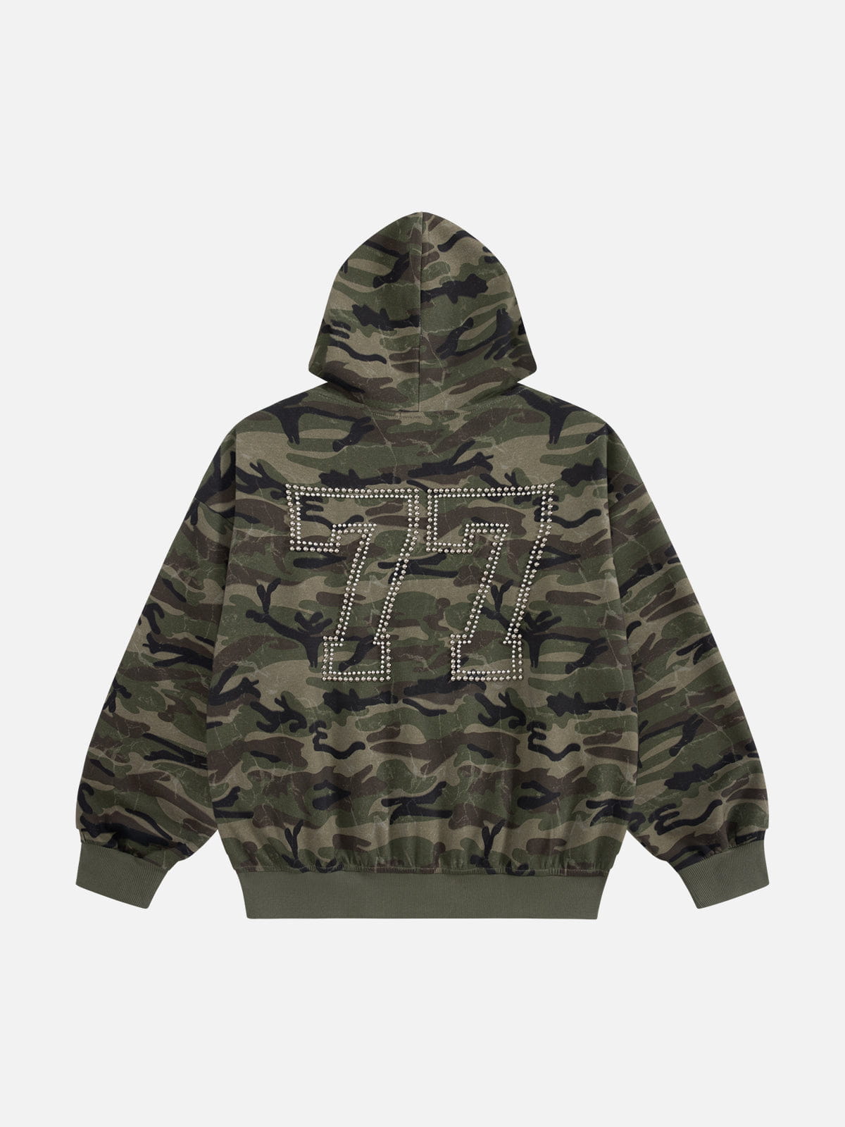 Featuring an all-over camouflage, this piece brings edge and attitude to your everyday rotation. The standout back design showcases a striking "77" made from metal studs, giving it a rugged, statement finish. A detailed embroidered brand logo sits on the chest for a touch of authenticity.