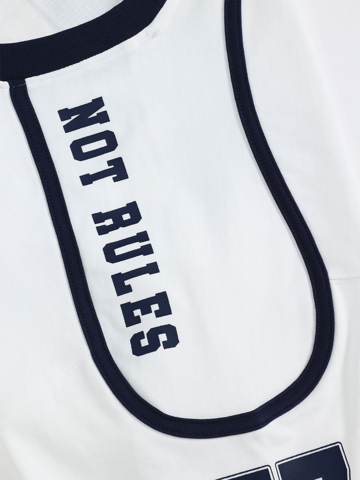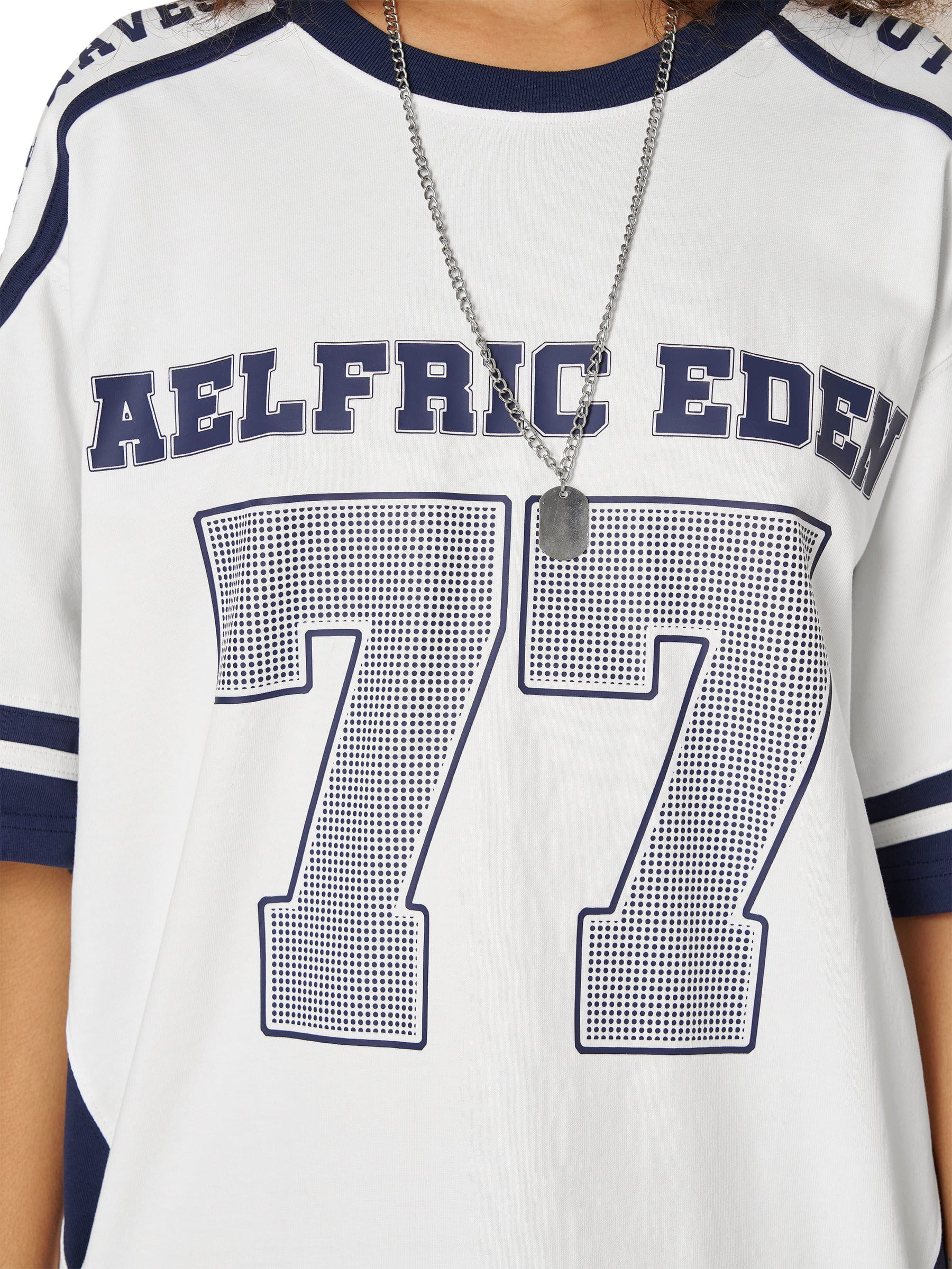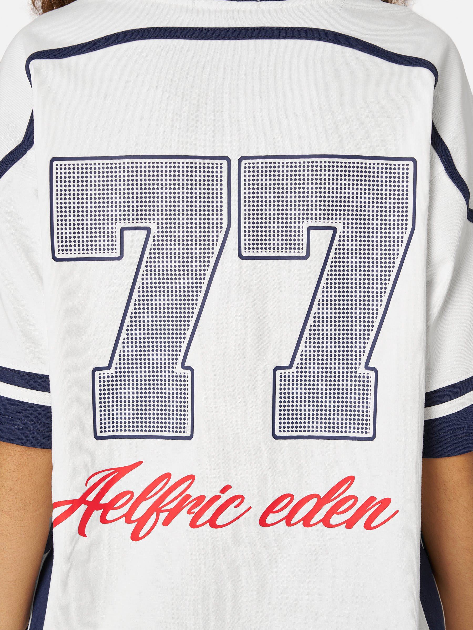 Show off bold sporty vibes with this white short-sleeved jersey featuring a striking “77” number print inspired by classic jersey designs. Made from soft, breathable cotton, this tee offers a comfortable fit with a modern athletic edge.