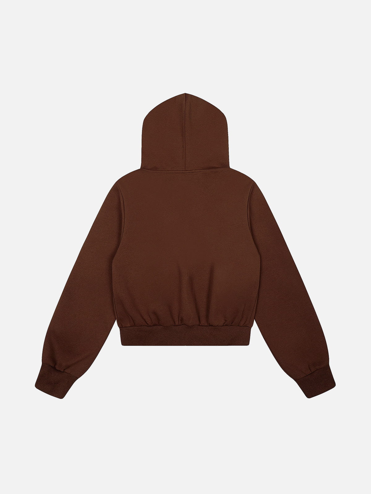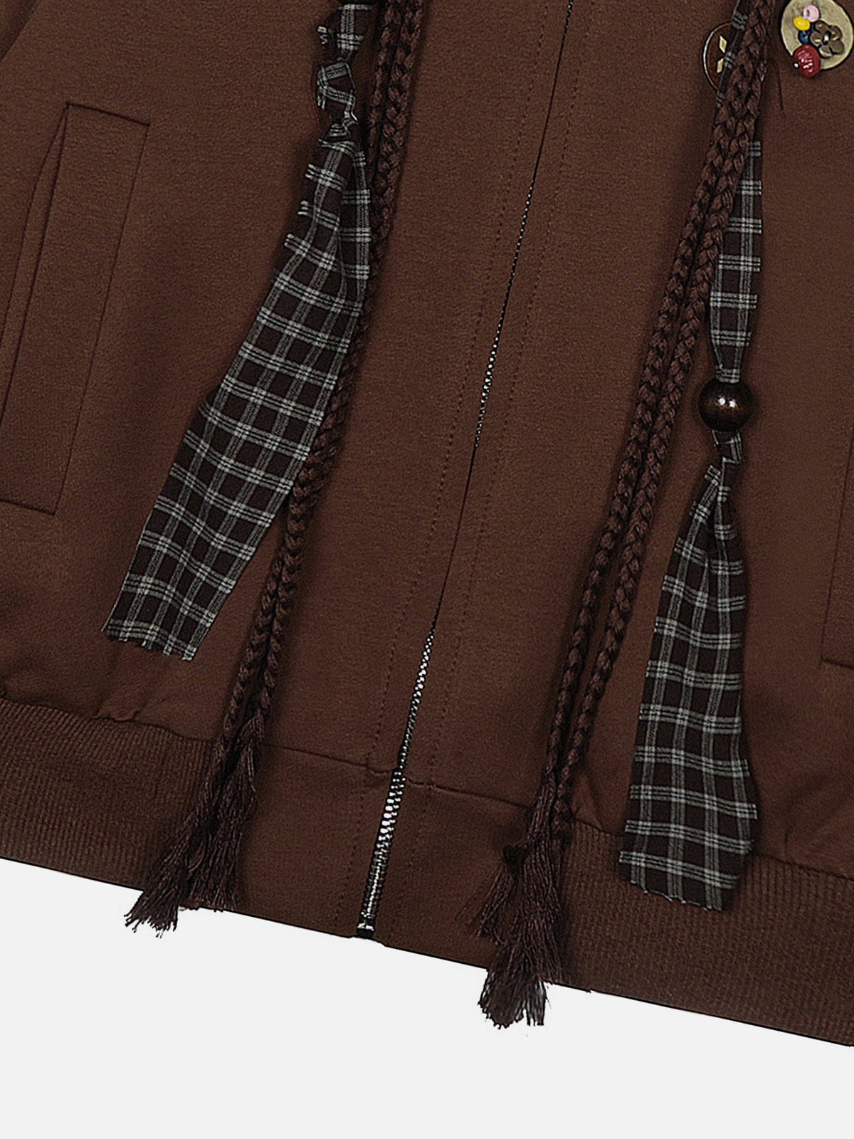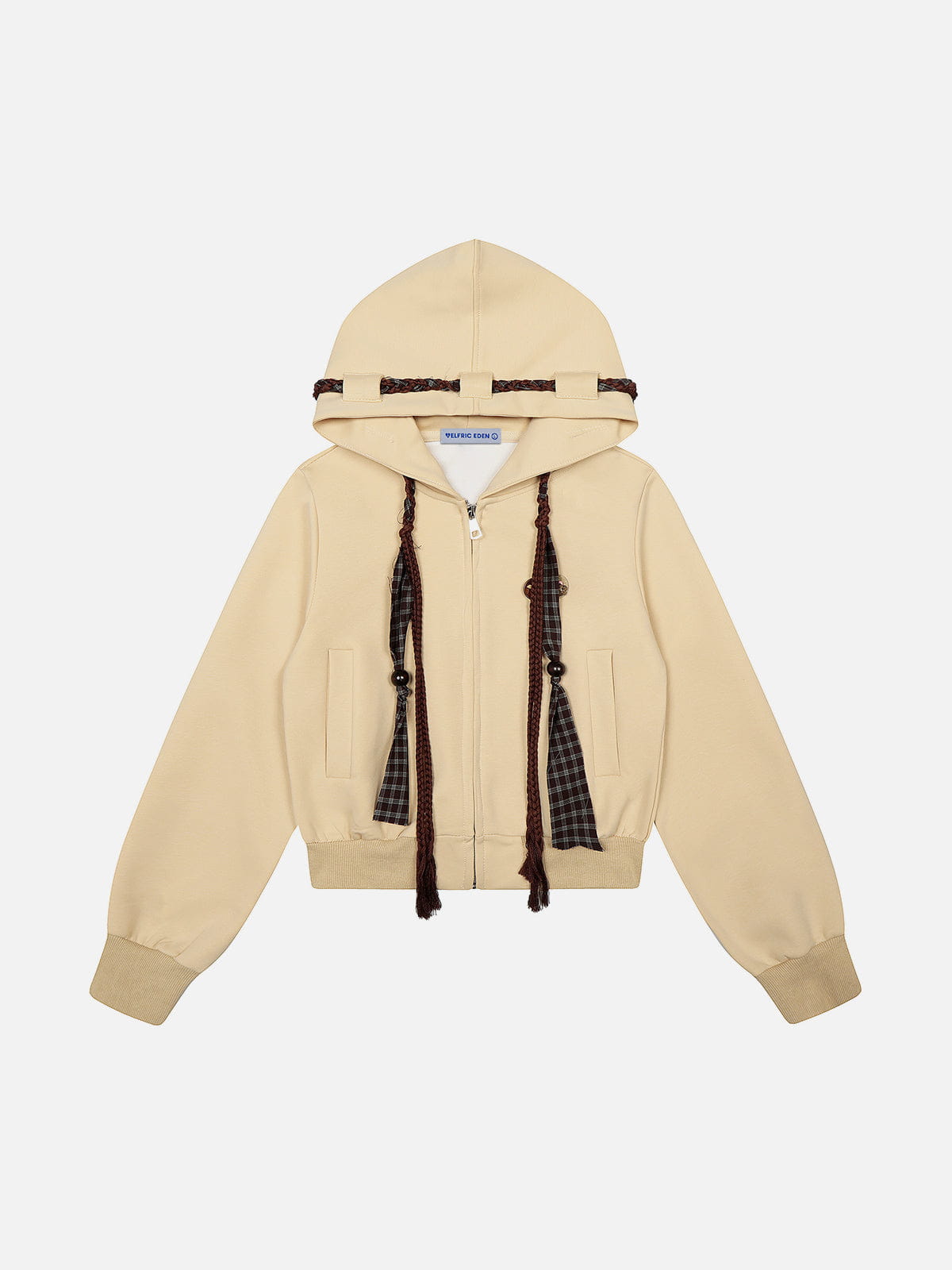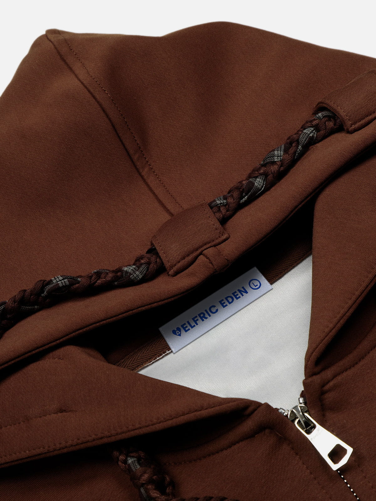 This cropped zip up hoodie features braided rope drawstrings with plaid fabric accents, adding texture and contrast to a clean silhouette. Soft-touch fabric keeps it comfortable for everyday wear, while the shortened length sharpens proportions. A functional zip front makes layering easy without losing visual focus.