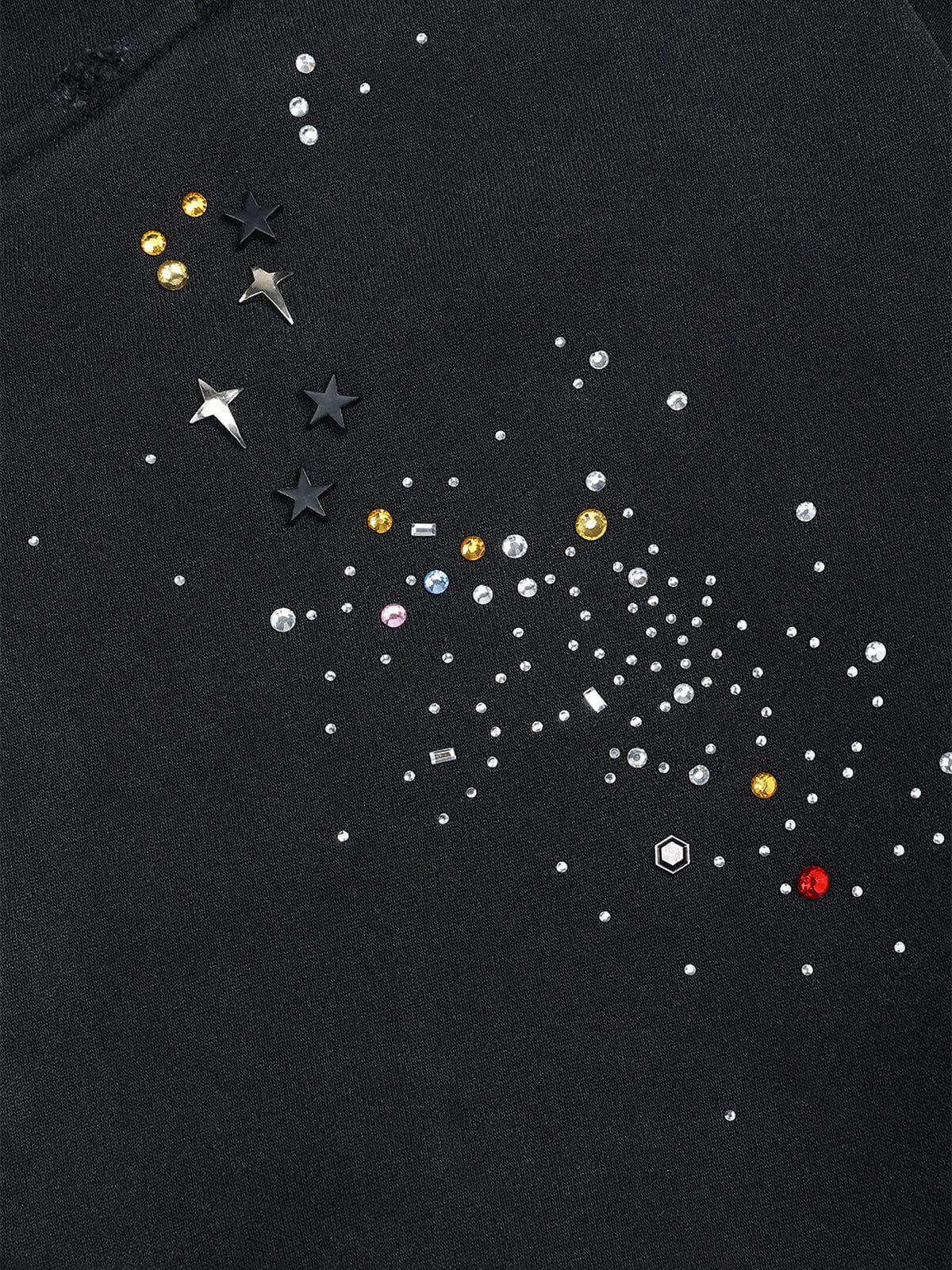 Inspired by the rising rhinestone trend, this boxy hoodie pushes the look further with a galaxy-like design—colorful stones scattered across the chest like a band of stars. Made from soft cotton for everyday comfort, it features a relaxed, laid-back silhouette that’s easy to throw on with yoga pants, sweats, or whatever you’re wearing on the go. A standout piece that turns a trend into something personal, expressive, and effortlessly wearable.Material: 100% Cotton.