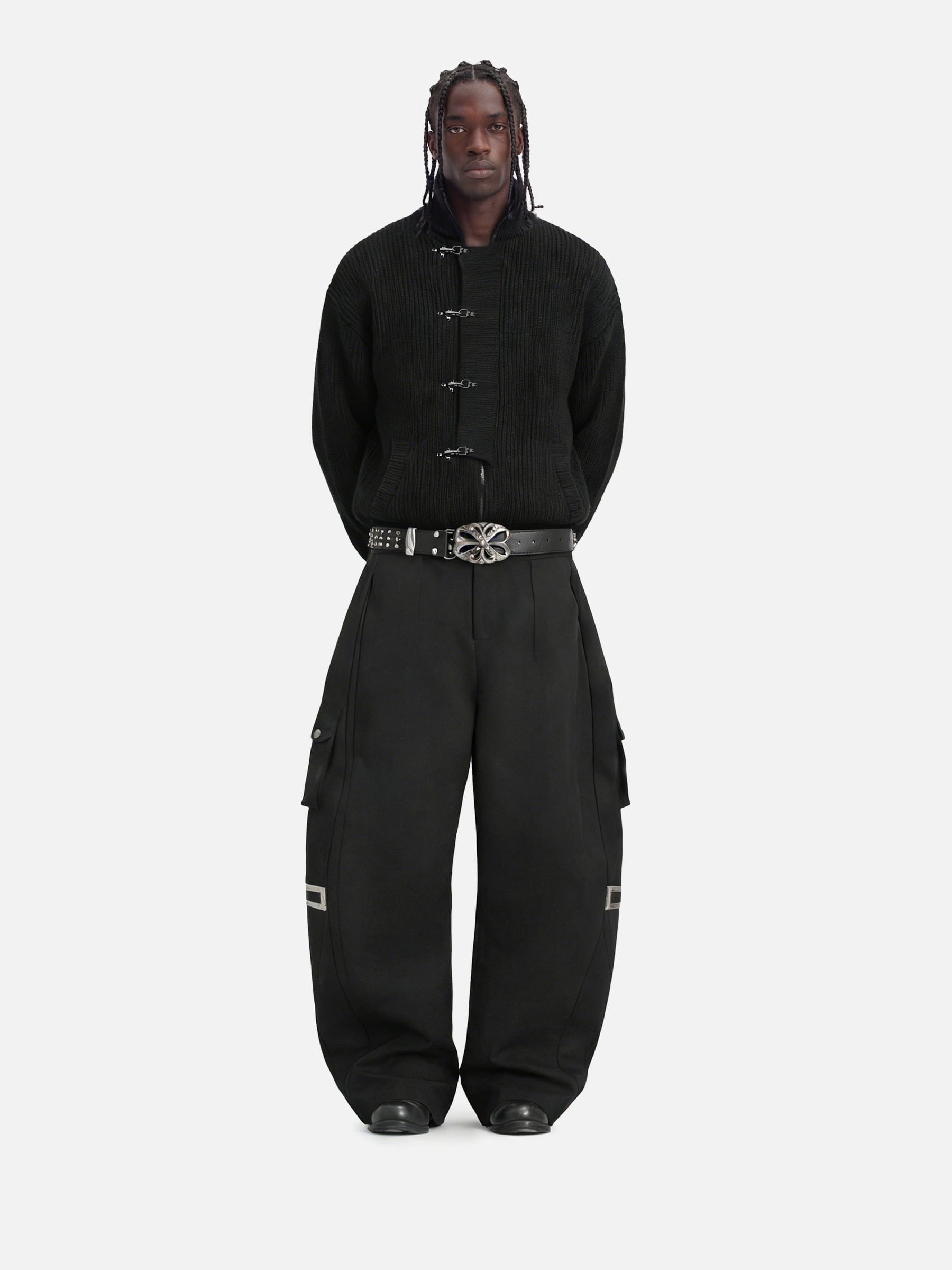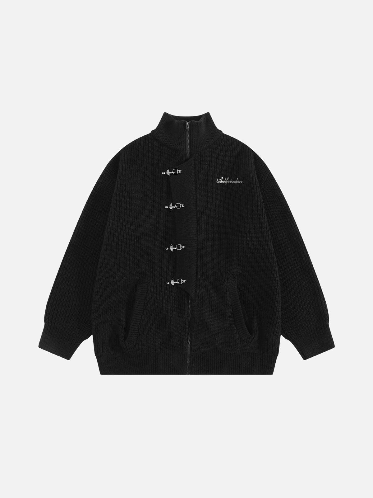 Built from a textured knit, this cardigan features a clean zip-front construction layered with metal fireman clasps, adding both visual depth and a structured edge. The high neckline sharpens the overall silhouette, while ribbed cuffs and hem ensure a secure, finished fit.
