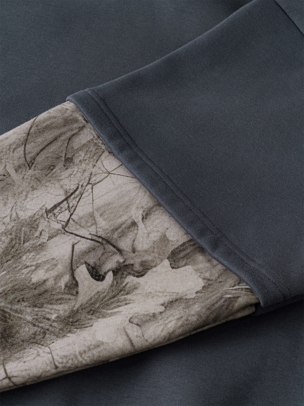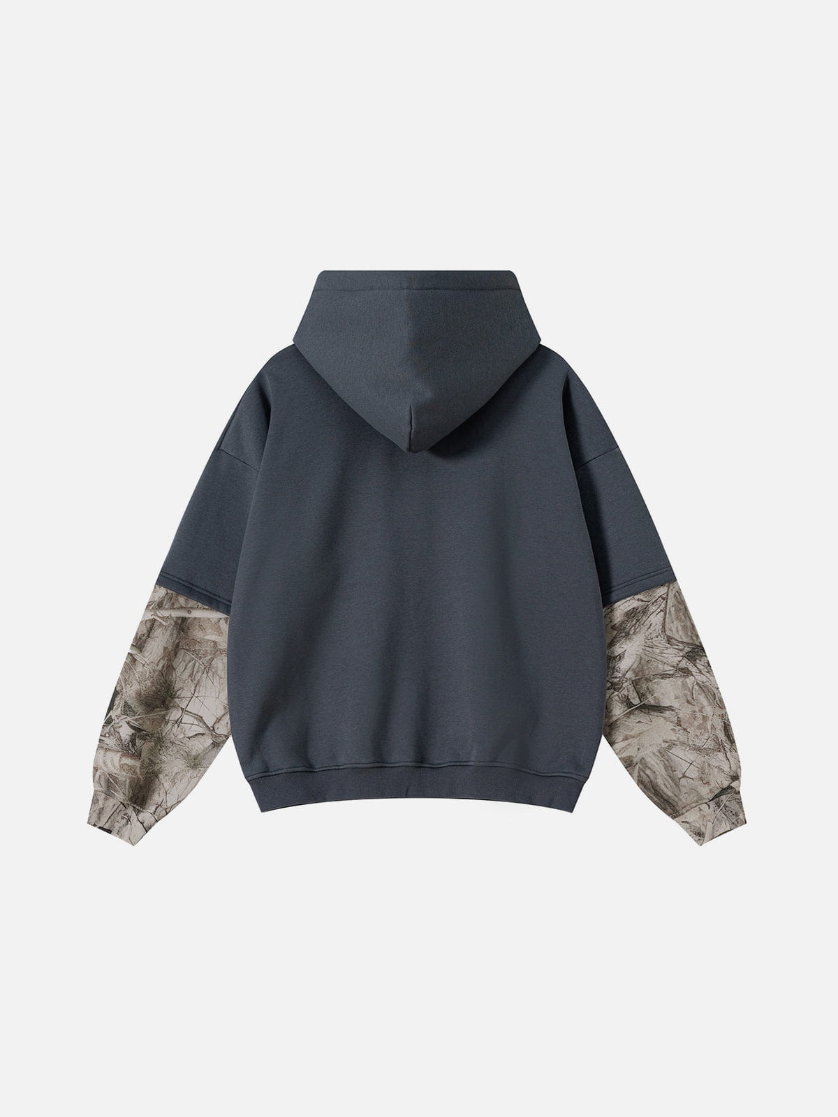 This pullover hoodie features a contrast camo sleeve design that creates a layered look without extra bulk. The solid body keeps the silhouette clean, while the camo sleeves bring visual depth and a subtle military edge. Cut in an oversized fit, it delivers a relaxed drape that works effortlessly for everyday street styling.