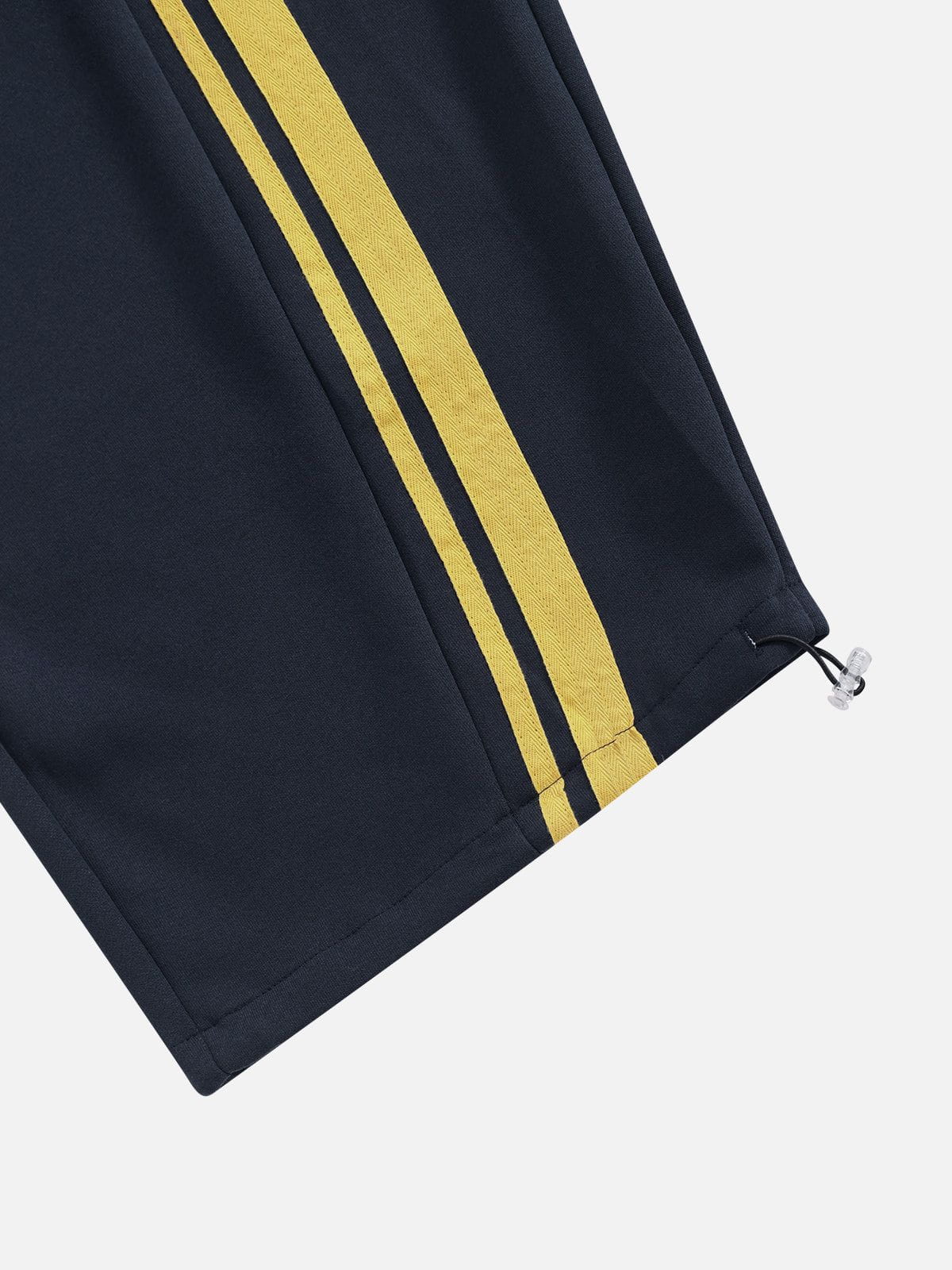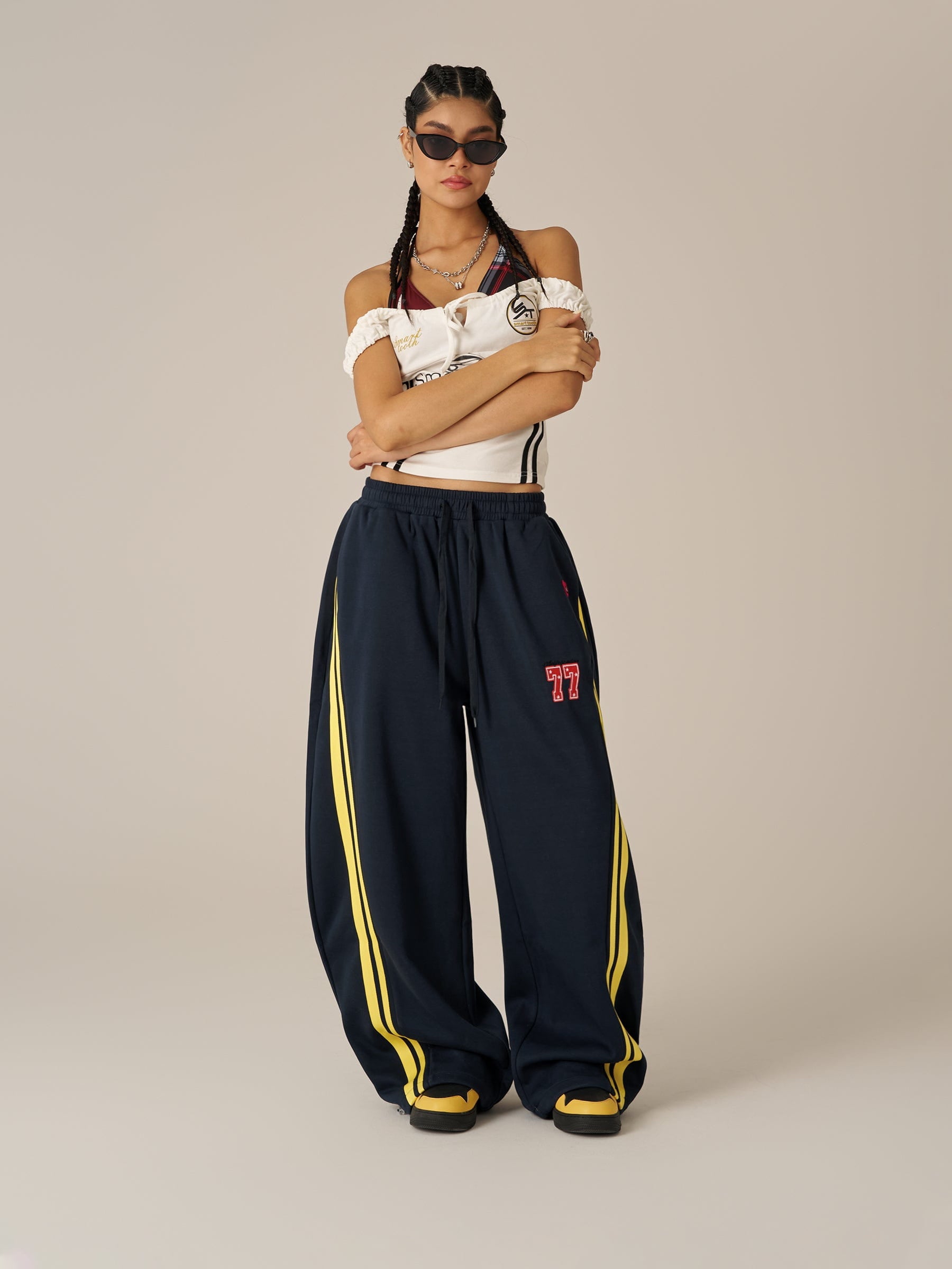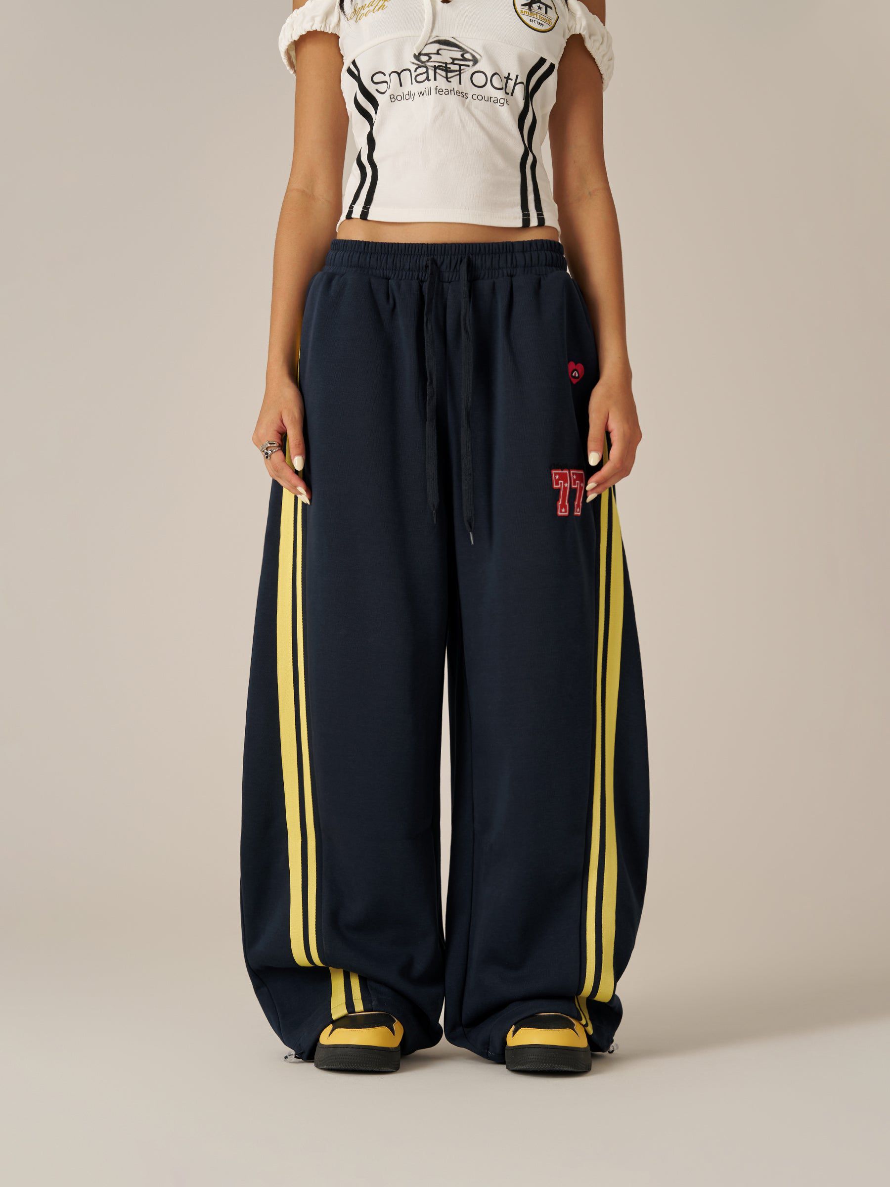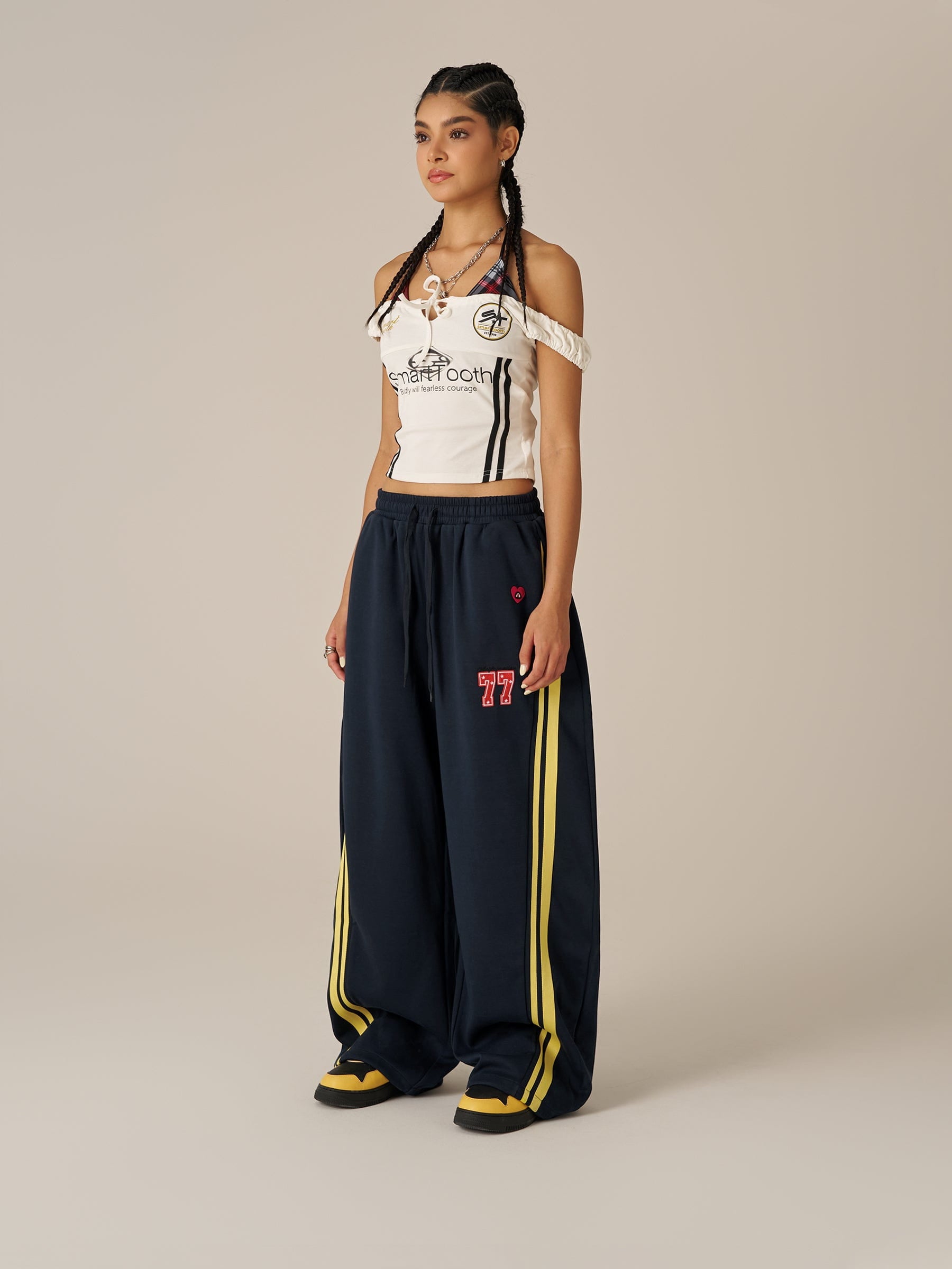 Featuring a clean black base with sharp yellow double-sided stripes, they deliver a retro-sport aesthetic with a modern twist. The red "77" patch and heart logo embroidery add standout contrast and signature identity.