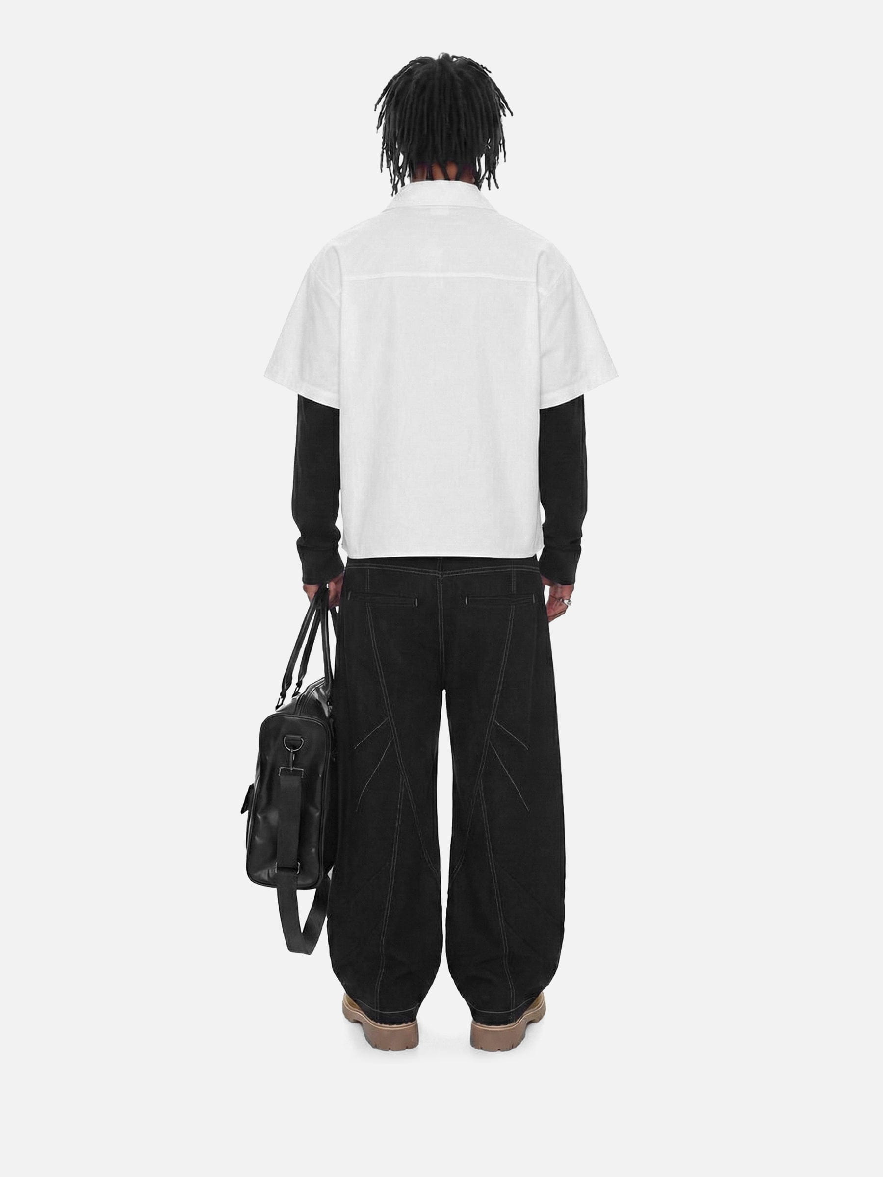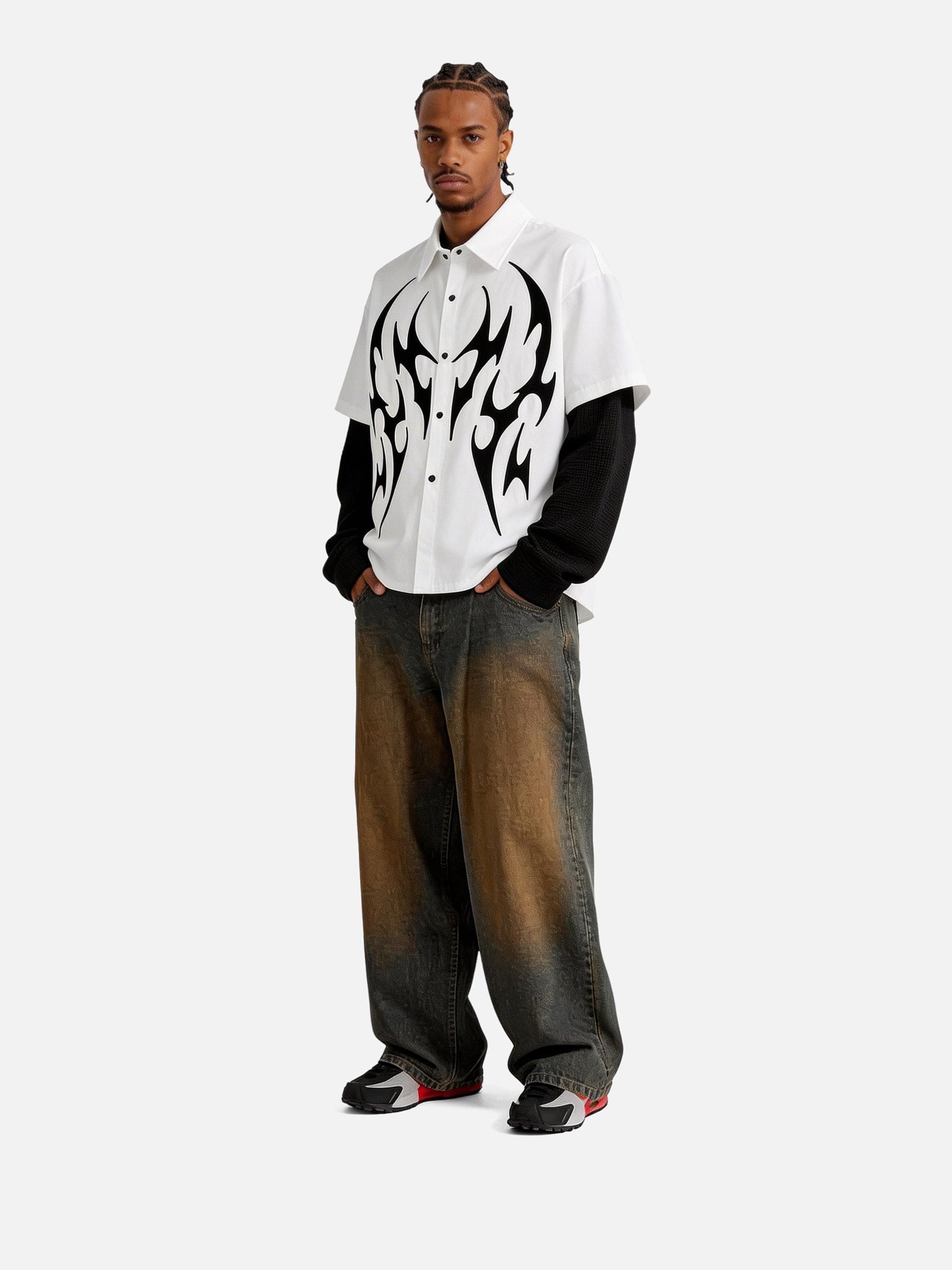 This long sleeve shirt features a bold tribal panel design across the front, contrasted with layered black sleeves for a structured two-tone effect. The classic collar and button-down closure keep the silhouette clean, while the mixed-fabric sleeves add depth and texture. Designed with strong visual balance and precise placement detailing.