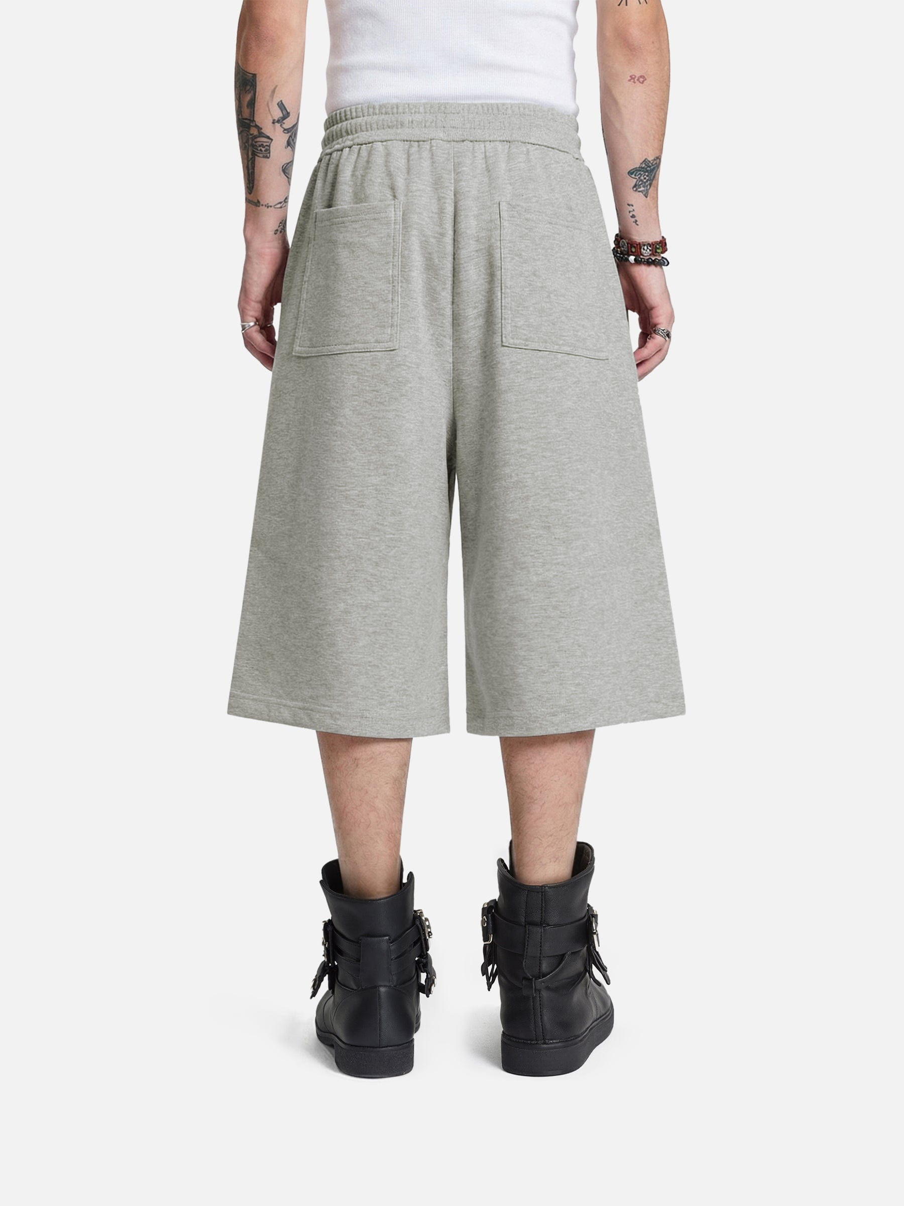 An extended longline length gives these shorts a relaxed, laid-back profile. The fabric surface shows natural wrinkle texture, adding depth without extra detailing. An elastic waistband with drawstring keeps the fit adjustable and easy. With a loose drape through the leg, they work well for everyday wear and simple street styling.