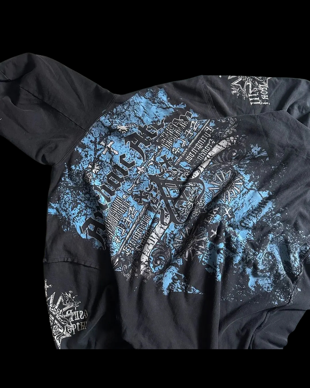 Black full-zip hoodie washed with slate-blue and bone-white gothic overlays. Stacked scripture, sunbursts, and archaic hits blasting across the chest and sleeves. Roomy hood, kangaroo pockets, ribbed cuffs/hem, and a broken-in weight. Blend, true to size, and ready to ship.