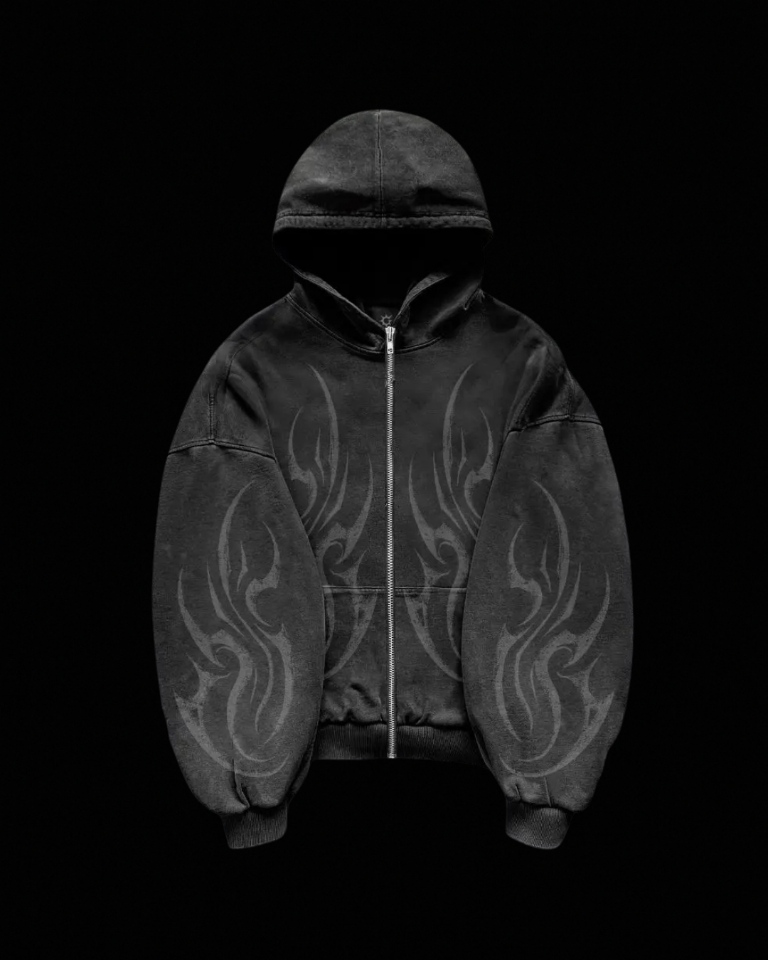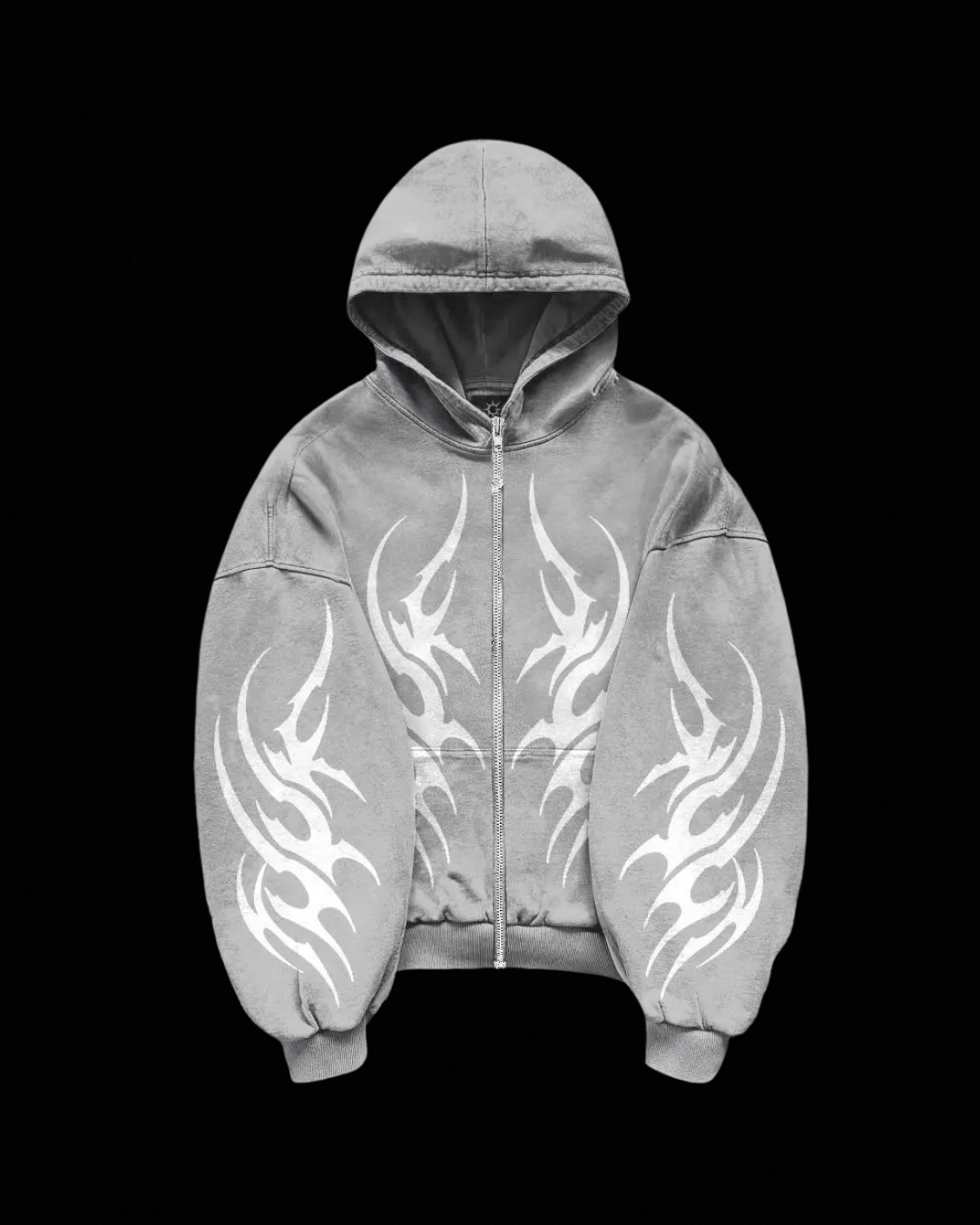 Full-zip hoodie with oversized tribal hits across the chest and sleeves—clean, aggressive, and easy to style. Washed mid-heavy fleece, roomy drop-shoulder fit, ribbed cuffs/hem, and kangaroo pockets for everyday wear. High quality cotton blend, true to size, and ready to ship.