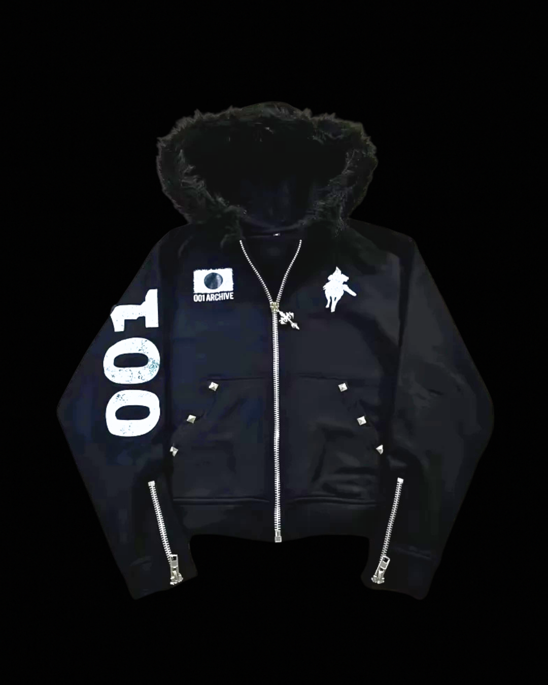 Black full-zip hoodie with a faux-fur hood, metal hardware, and utility details—“001” sleeve hit, chest patches, pyramid-stud pocket corners, and zippered cuffs. Mid-heavy feel, relaxed fit, split kangaroo pockets, and ribbed trims. Blend, true to size, and ready to ship.