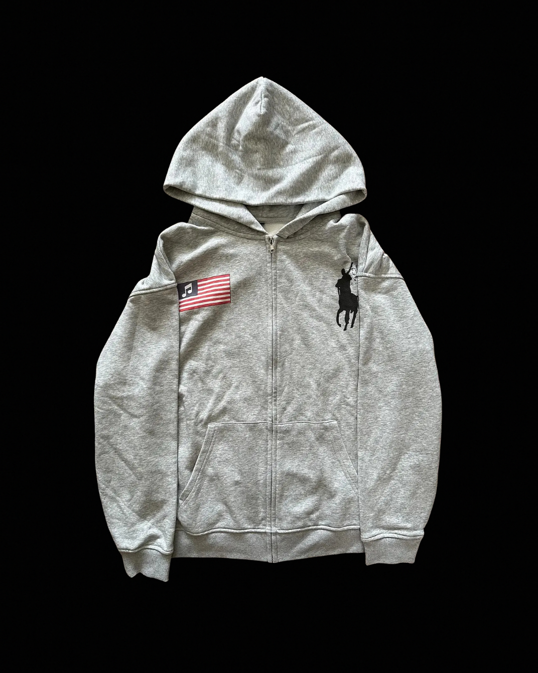 Heather-grey full-zip hoodie with clean chest hits—a U.S. flag patch on the left and a rider crest on the right. Mid-weight, relaxed fit, split kangaroo pockets, and ribbed cuffs/hem. Cotton blend, true to size, and ready to ship.