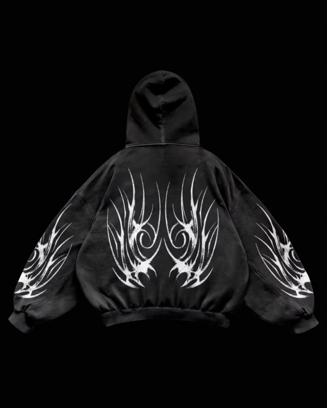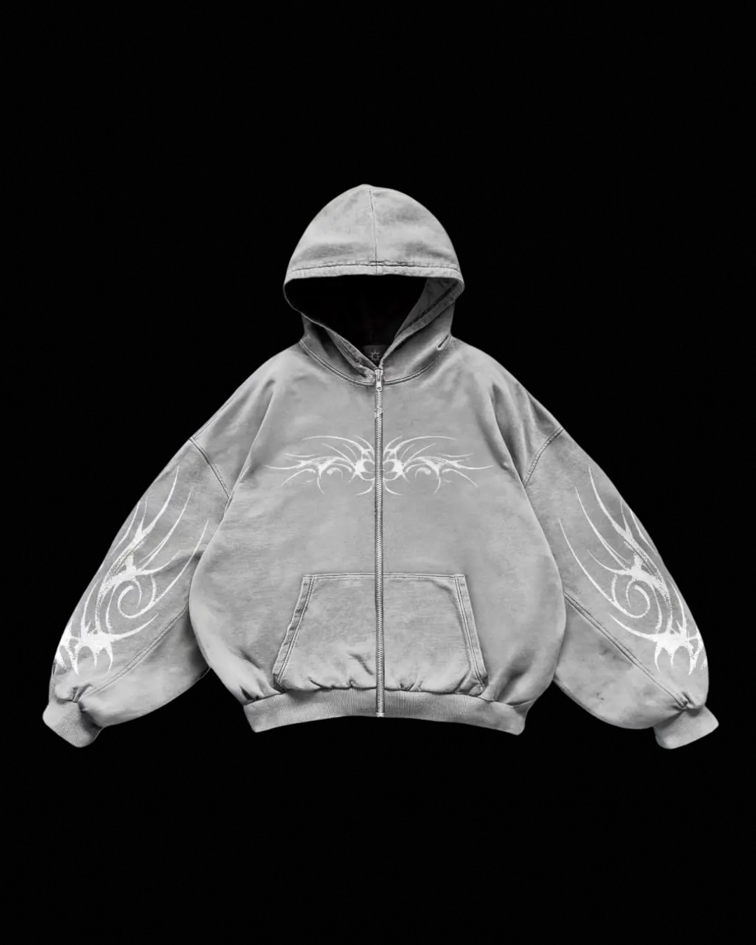 Washed-black zip hoodie with sharp tribal graphics across the chest and sleeves. Heavyweight fleece with a roomy drop-shoulder fit, kangaroo pocket, and ribbed cuffs/hem. Cotton polyester blend, true to size, and ready to ship.